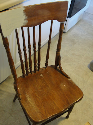 There were actually 2 of the same chair. As you see this one is missing a rung and the screws on top had been replaced with too-long ones so the sharp ends were poking out of the corner (they were covered by band-aids so no one would get hurt!) The other chair had a split seat so we stole the missing rung and screws and left it all sad and worthless - but we now had one full chair!